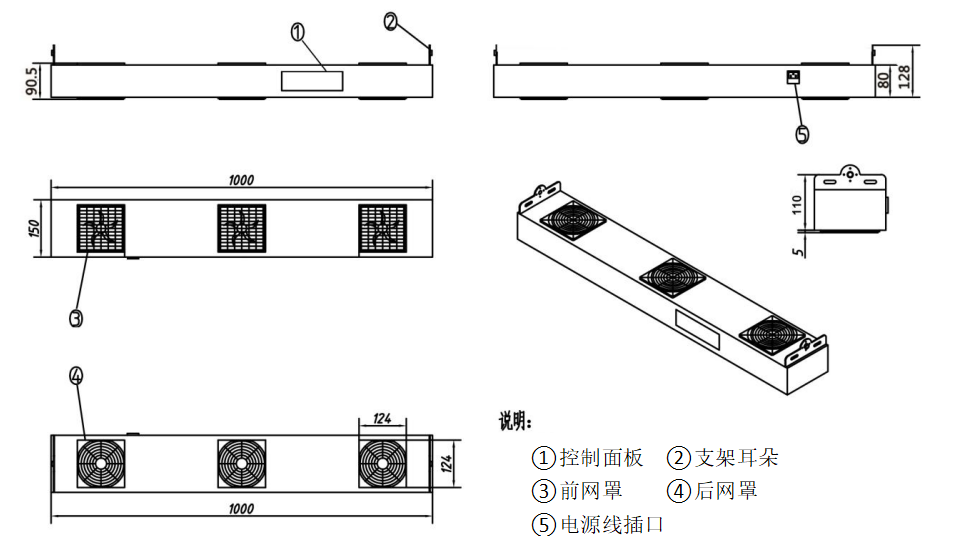 1000mm(L)*150mm(W)*80mm(H)(含支架耳朵)
