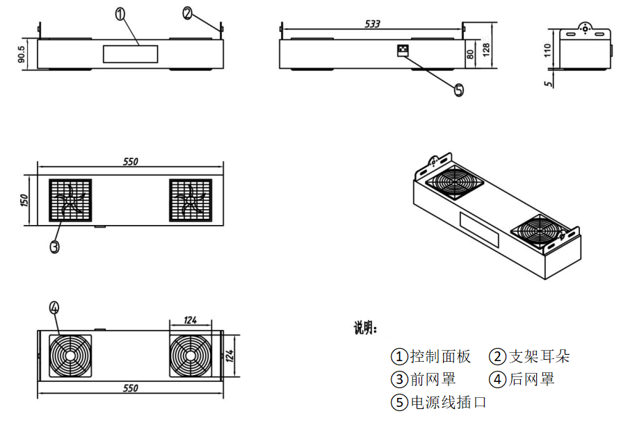550mm(L)*150mm(W)*80mm(H)(含支架耳朵)