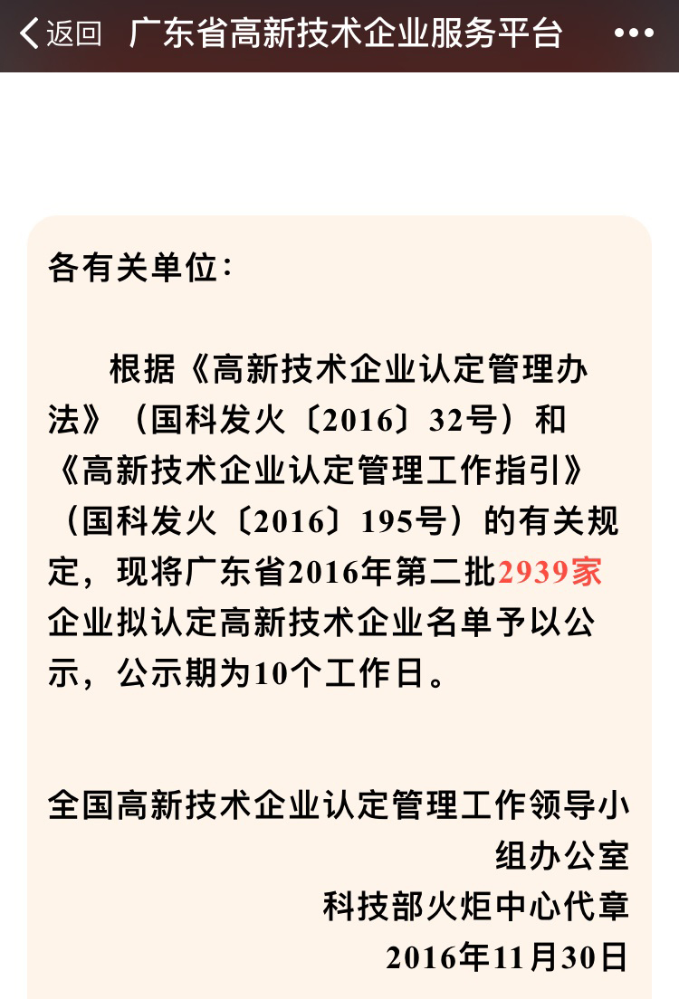 11月30日,全國(guó)高新技術(shù)企業(yè)認(rèn)定管理工作領(lǐng)導(dǎo)小組辦公室公布了2016年廣東省第二批擬認(rèn)定國(guó)家高新技術(shù)企業(yè)名單,共2939家企業(yè)通過國(guó)家高新技術(shù)企業(yè)認(rèn)定??茍@榜上有名,榮獲國(guó)家高新技術(shù)企業(yè),這是對(duì)我司的高度認(rèn)可,更堅(jiān)定了我們自主研發(fā)、自主創(chuàng)新,堅(jiān)持中國(guó)創(chuàng)造的產(chǎn)業(yè)決心!
